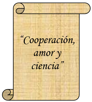 Por último, en la parte superior del escudo está escrito el lema de La Institución: “Cooperación, amor y ciencia”.