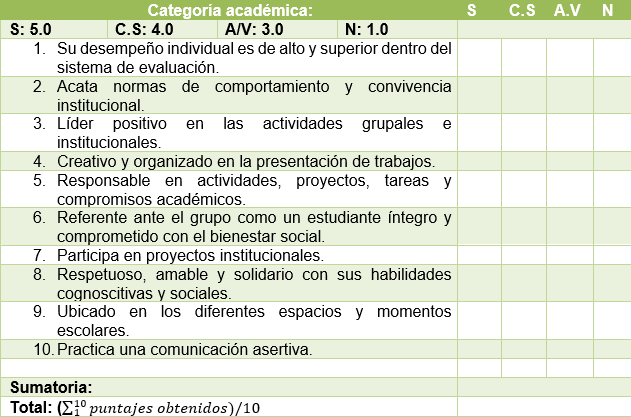 Selección de un estudiante por grupo, que cumpla cabalmente con los criterios establecidos. Se define como una categoría que demostrará las habilidades intelectuales, talentos y destrezas para alcanzar altos niveles de exigencia en el conocimiento, viendo en dichos estudiantes logros constantes no solo en evaluaciones, trabajos, talleres, actividades, etc; sino también, en procesos de humanización con los demás compañeros.