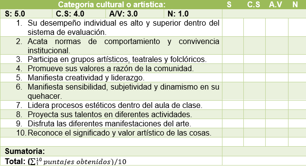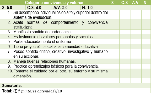Selección de un estudiante por grupo. Se define como una categoría que seleccionará a los estudiantes que promuevan en sus vidas altos niveles de disciplina, comportamiento y cultura; donde los valores personales, sociales y trascendentales se ven reflejados en su quehacer cotidiano. Además, muestra buenos procesos de comunicación asertiva y autocontrol para el manejo correcto de situaciones conflictivas.