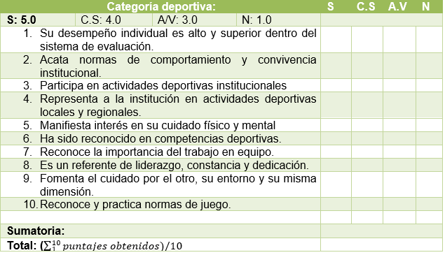 Selección de 5 estudiantes por sede. Se define como una categoría que buscará aquellos estudiantes talentosos en alguna disciplina deportiva y que tengan reconocimiento a nivel institucional, municipal, departamental o nacional. Que sean la muestra viva del esfuerzo, la dedicación, el trabajo y las buenas prácticas de competitividad. Además, su accionar debe, en gran porcentaje, estar enmarcado en la representación de nuestra institución.